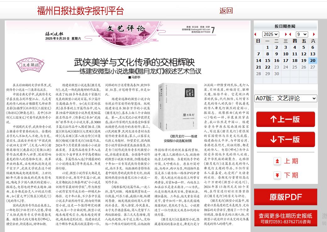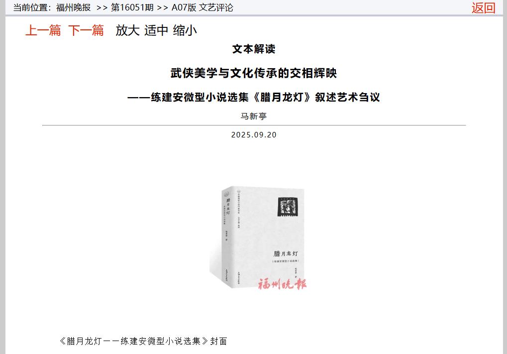 在五彩斑斓的文学世界里,武侠传奇小说这一门类源远流长。 中国古典文学中,武侠传奇文学甚至能占到半壁江山。凡是有龙的传人的地方都摆有几部世界名著《红楼梦》《水浒传》《三国演义》《西游记》《聊斋志异》。其中《水浒传》《三国演义》可看作武侠传奇小说。 中国现代文学,武侠传奇小说占据着非常重要的地位。金庸的名字无人不知无人不晓,与古龙、梁羽生、温瑞安并称为“中国武侠小说四大宗师”。《天龙八部》《射雕英雄传》《鹿鼎记》《笑傲江湖》等作品风靡华人世界,深刻影响着龙的传人的思维和生活。改革开放的春风,让电视机逐渐走进千家万户,武侠文学就在这个时候被改编成电视连续剧。上世纪80年代港台拍成的武侠电影电视,唤起多少国人强烈的爱国心、报国志,电影电视中的主题曲、插曲,至今都是脍炙人口的流行歌曲,如《霍元甲》《陈真》《精武门》《龙的传人》等。 国内武侠传奇作品后来居上,一部电影《少林寺》万人空巷,带动了大陆武侠传奇文学的蓬勃发展。极像今天的火爆电影《哪吒》,横空出世,街谈巷议,好评如潮。 练建安微型小说选集《腊月龙灯》,也是一部武侠题材的作品集,收录了他10多年来在数十家报刊发表的微型小说近百篇,不少篇什当属精品力作。如《我们家的张燕》在参赛的上万篇作品中,进入第19届中国微型小说年度奖50篇提名作品中。《传拳记》参加“武陵杯”世界华文小小说大赛,在3000多篇应征作品中入围前20名。《做客》《斩乌蚊》《墟胆》《七里滩》《悬绳峰》《乌石滩》《第八级台阶》《旧篷船》《梅姨》《腊月龙灯》10篇作品,2024年3月荣获第10届小小说金麻雀奖。多篇作品连续多年入选全国31个省市重点中学高考模拟试卷。多篇作品入选《中国最好的小小说精选集》等年度选本、年度排行榜。 以前,微型小说作家大都是先写微型小说,再写中长篇小说,故大家都把托尔斯泰所说“小小说是训练作家最好的学校”,作为微型小说作家写作成长的一种模式和路径。近十年以来,不少在中长篇小说名声赫然的作家,转向创作微型小说,这是一个值得研究的课题,从另一个方面说明,微型小说越来越有吸引力,越来越受到重视,越来越受到欢迎。练建安就是这个群体中成果比较显著的一位,同样的例子还有像高春阳、欧阳华丽、红墨、方冠睛等作家,亦是如此。 练建安选择的微型小说方向体现出作家创作的智慧性。纵观练建安这本30余万字的小说集《腊月龙灯》,基本上由三个方面组成。第一,是从笔记小说中获得灵感,揉以作家现代生活感受和客家地域特色而进行的再创作;第二,以民间故事、民间生活为素材为其创作的重要源泉;第三,以客家文化侠义为题材。仰望星空,国内微型小说作家灿若星辰浩浩荡荡,但是专门创作武侠传奇系列微型小说,非练建安莫属。全国每年创作的微型小说数不胜数,但像练建安十年如一日专写武侠传奇微型小说,尚不多见。他孤独的身影传承着中国优秀的武侠传奇文化,他满腔的热情弘扬着笔记体小说这一写作手法。 《鸿雁客栈》这篇作品,一波三折,荡气回肠。鸿雁客栈掌柜是一位侠盗,叫吕三娘,威镇江湖,纵横闽粤赣。她发现投宿的商人非常纯朴善良。商人推窗,冷风袭来,女子失手酒壶落地,商人竟留下三两纹银赔偿。第二天天色曈曈,商人起床赶路,女子追上商人,交给他一个两头对接的竹筒,让他把物件捎给漳州府的悦来客栈掌柜。途中,遇上几拨精壮人马,欲抢劫他身上的财物。当看到他手中的竹筒,又呼啸而去。原来竹筒对接,为两口,两口为吕,所捎物件其实是吕三娘为他一路保护的护身符。商人到达州府后捐上所带百两黄金,买官知县一职。而他当上知县后不是清正廉洁,一心为民,而是任期内鱼肉百姓,贪赃枉法,横征暴敛。三年后,他又重金买通关节,晋升知州一职,再次夜宿鸿雁客栈时,竟然死于马上。小说塑造了一位行侠仗义疾恶如仇的女侠形象。 《腊月龙灯》这篇微型小说,隐藏着深刻的象征意义,舞龙灯是汀江流域一种隆重的民俗,龙灯入屋,买田造屋,祈福消灾,驱邪灭魔,保佑平安。它是闽江两岸的民俗,代代相传,又何曾不是龙的传人的民俗?寄托着龙的传人舞龙灯强烈的爱国心、报国志。就像歌曲《我的中国心》唱的一样,洋装虽然穿在身,我心依然是中国心。练建安身为中原衣冠南渡的客家人,写这篇《腊月龙灯》有很深的家国情怀与历史文化底蕴。福建面向太平洋,与中国台湾、香港近在咫尺,同祖同根,都是龙的传人。电影《哪吒》为什么深受异国他乡龙的传人欢迎,是中华民族的凝聚力。也难怪《腊月龙灯》这篇表达龙的传人舞龙灯主题的作品,不但作家本人最喜爱,也受到广大读者的欢迎。每期发行量曾经高达七十万册的《微型小说选刊》,2024年第13期用足足10个页码,在作家进行时栏目隆重推出《腊月龙灯》的原文与评论。 《腊月龙灯》微型小说集中,练建安以其高度的艺术表现力、文白相容的文学语言,塑造了一个个身怀绝技、除暴安良的江湖人物,用微型小说这种方兴未艾的文体展现龙的传人的精气神。 (全文共2058字)