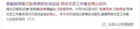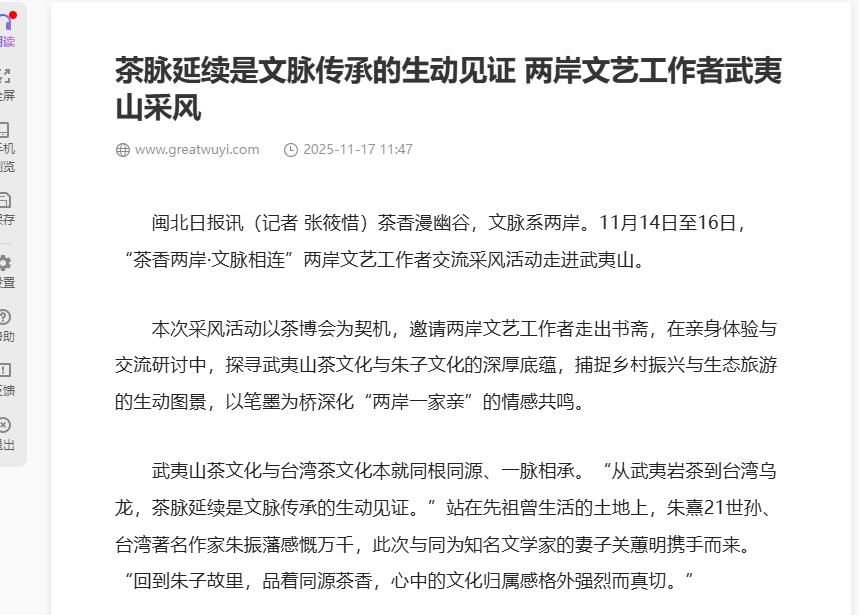 闽北日报讯(记者 张筱惜)茶香漫幽谷,文脉系两岸。11月14日至16日,“茶香两岸·文脉相连”两岸文艺工作者交流采风活动走进武夷山。
