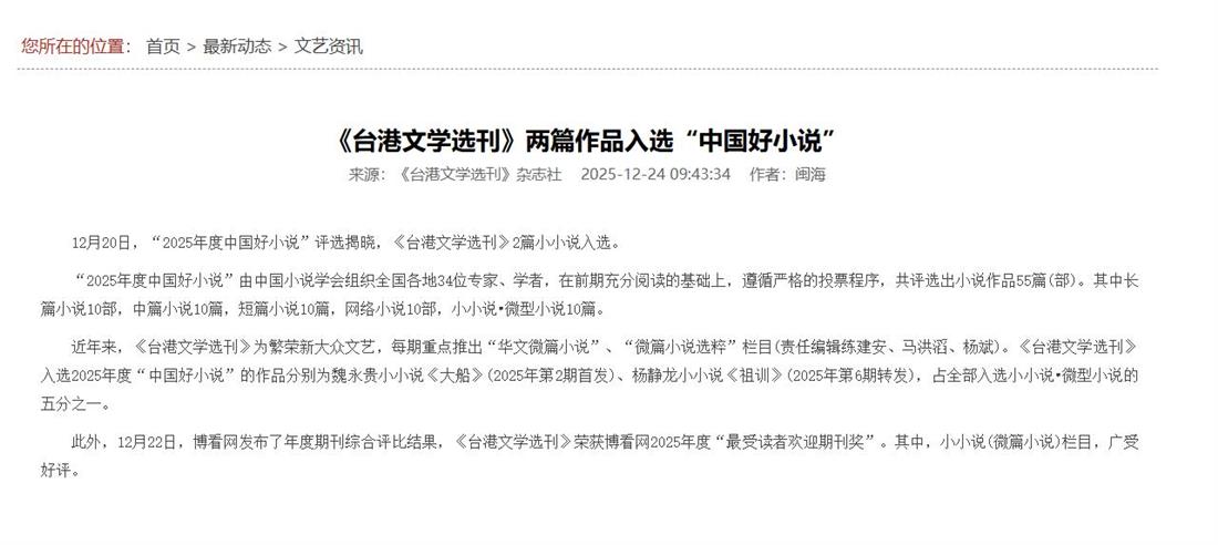 “2025年度中国好小说”由中国小说学会组织全国各地34位专家、学者,在前期充分阅读的基础上,遵循严格的投票程序,共评选出小说作品55篇(部)。其中长篇小说10部,中篇小说10篇,短篇小说10篇,网络小说10部,小小说•微型小说10篇。 近年来,《台港文学选刊》为繁荣新大众文艺,每期重点推出“华文微篇小说”、“微篇小说选粹”栏目(责任编辑练建安、马洪滔、杨斌)。《台港文学选刊》入选2025年度“中国好小说”的作品分别为魏永贵小小说《大船》(2025年第2期首发)、杨静龙小小说《祖训》(2025年第6期转发),占全部入选小小说•微型小说的五分之一。 此外,12月22日,博看网发布了年度期刊综合评比结果,《台港文学选刊》荣获博看网2025年度“最受读者欢迎期刊奖”。其中,小小说(微篇小说)栏目,广受好评。