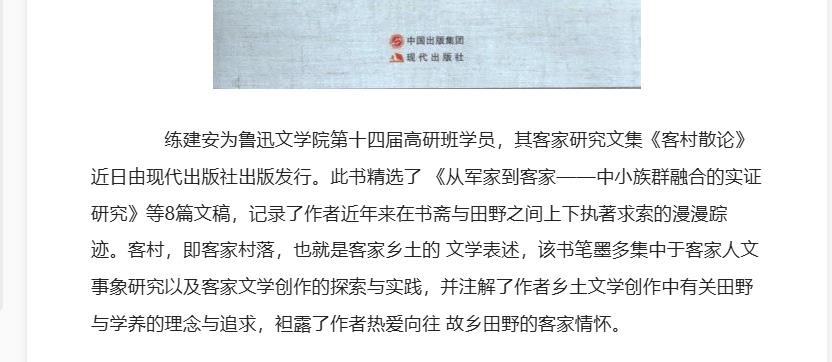 练建安著《客村散论》(现代出版社出版)